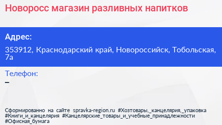 Новоросс, магазин разливных напитков по адресу 353912, Краснодарский край, Новороссийск, Тобольская, 7а в дальнейшем Организация, размещена в следующих категориях: