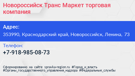 Новороссийск Транс Маркет, торговая компания по адресу 353990, Краснодарский край, Новороссийск, Ленина, 73 в дальнейшем Организация, размещена в следующих категориях: