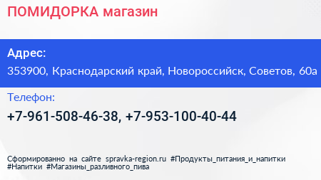 ПОМИДОРКА, магазин по адресу 353900, Краснодарский край, Новороссийск, Советов, 60а в дальнейшем Организация, размещена в следующих категориях: