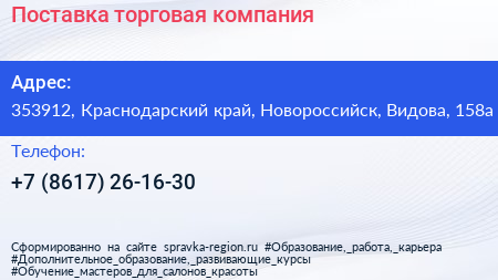 Поставка, торговая компания по адресу 353912, Краснодарский край, Новороссийск, Видова, 158а в дальнейшем Организация, размещена в следующих категориях: