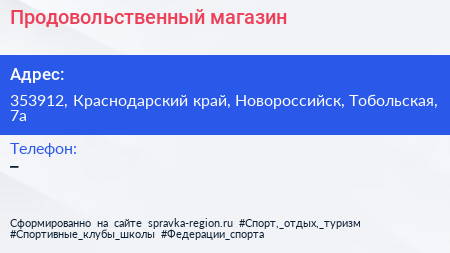 Продовольственный магазин по адресу 353912, Краснодарский край, Новороссийск, Тобольская, 7а в дальнейшем Организация, размещена в следующих категориях: