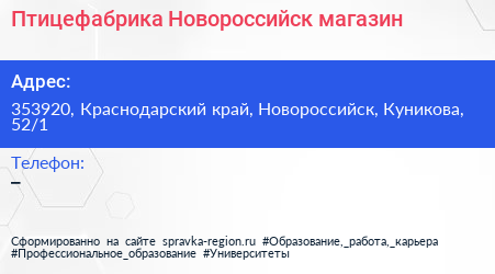 Птицефабрика Новороссийск, магазин по адресу 353920, Краснодарский край, Новороссийск, Куникова, 52/1 в дальнейшем Организация, размещена в следующих категориях: