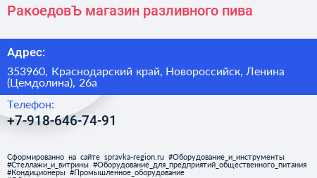 РакоедовЪ, магазин разливного пива по адресу 353960, Краснодарский край, Новороссийск, Ленина (Цемдолина), 26а в дальнейшем Организация, размещена в следующих категориях: