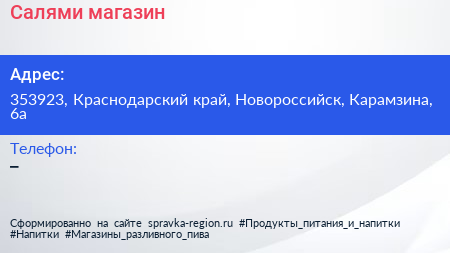 Салями, магазин по адресу 353923, Краснодарский край, Новороссийск, Карамзина, 6а в дальнейшем Организация, размещена в следующих категориях: