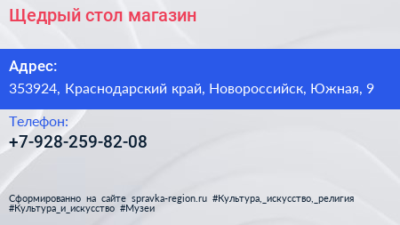 Щедрый стол, магазин по адресу 353924, Краснодарский край, Новороссийск, Южная, 9 в дальнейшем Организация, размещена в следующих категориях: