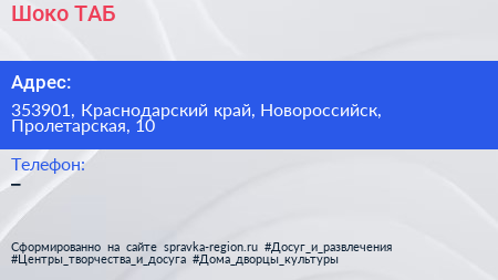 Шоко-ТАБ по адресу 353901, Краснодарский край, Новороссийск, Пролетарская, 10 в дальнейшем Организация, размещена в следующих категориях: