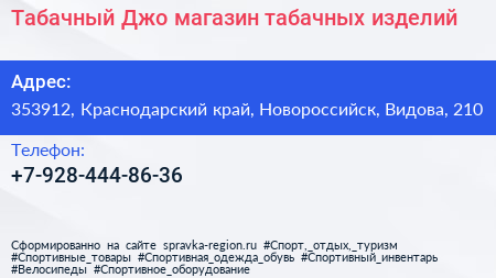 Табачный Джо, магазин табачных изделий по адресу 353912, Краснодарский край, Новороссийск, Видова, 210 в дальнейшем Организация, размещена в следующих категориях: