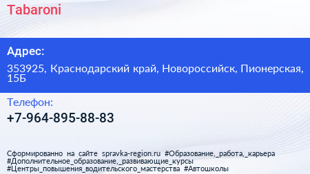 Tabaroni по адресу 353925, Краснодарский край, Новороссийск, Пионерская, 15Б в дальнейшем Организация, размещена в следующих категориях: