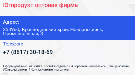 Югпродукт, оптовая фирма по адресу 353960, Краснодарский край, Новороссийск, Промышленная, 3 в дальнейшем Организация, размещена в следующих категориях: