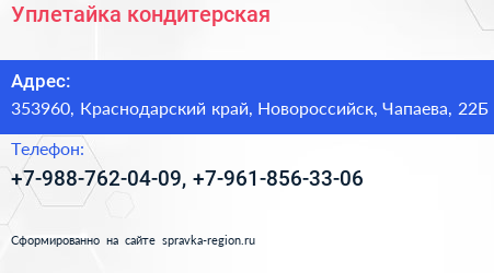 Уплетайка, кондитерская по адресу 353960, Краснодарский край, Новороссийск, Чапаева, 22Б в дальнейшем Организация, размещена в следующих категориях: