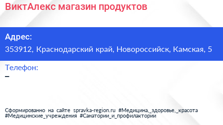 ВиктАлекс, магазин продуктов по адресу 353912, Краснодарский край, Новороссийск, Камская, 5 в дальнейшем Организация, размещена в следующих категориях: