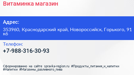 Витаминка, магазин по адресу 353960, Краснодарский край, Новороссийск, Горького, 91 к6 в дальнейшем Организация, размещена в следующих категориях: