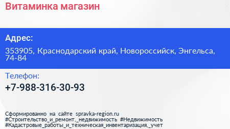 Витаминка, магазин по адресу 353905, Краснодарский край, Новороссийск, Энгельса, 74-84 в дальнейшем Организация, размещена в следующих категориях: