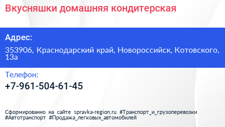 Вкусняшки, домашняя кондитерская по адресу 353906, Краснодарский край, Новороссийск, Котовского, 13а в дальнейшем Организация, размещена в следующих категориях:
