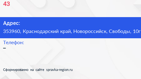 №43 по адресу 353960, Краснодарский край, Новороссийск, Свободы, 10г в дальнейшем Организация, размещена в следующих категориях: