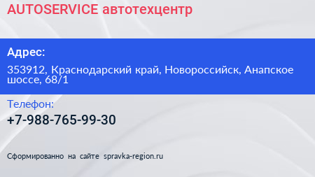 AUTOSERVICE, автотехцентр по адресу 353912, Краснодарский край, Новороссийск, Анапское шоссе, 68/1 в дальнейшем Организация, размещена в следующих категориях: