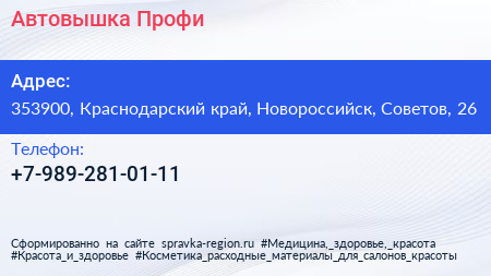 Автовышка Профи по адресу 353900, Краснодарский край, Новороссийск, Советов, 26 в дальнейшем Организация, размещена в следующих категориях: