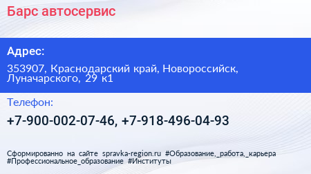 Барс, автосервис по адресу 353907, Краснодарский край, Новороссийск, Луначарского, 29 к1 в дальнейшем Организация, размещена в следующих категориях: