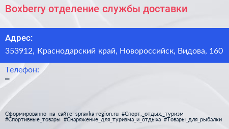 Boxberry, отделение службы доставки по адресу 353912, Краснодарский край, Новороссийск, Видова, 160 в дальнейшем Организация, размещена в следующих категориях: