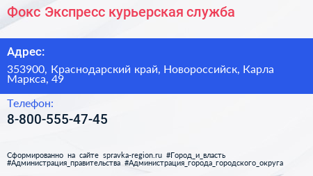 Фокс-Экспресс, курьерская служба по адресу 353900, Краснодарский край, Новороссийск, Карла Маркса, 49 в дальнейшем Организация, размещена в следующих категориях: