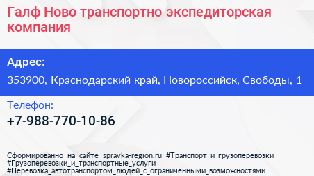 Галф Ново, транспортно-экспедиторская компания по адресу 353900, Краснодарский край, Новороссийск, Свободы, 1 в дальнейшем Организация, размещена в следующих категориях: