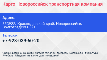 Карго-Новороссийск, транспортная компания по адресу 353922, Краснодарский край, Новороссийск, Волгоградская, 30 в дальнейшем Организация, размещена в следующих категориях: