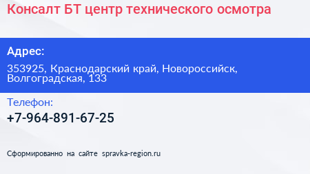 Консалт БТ, центр технического осмотра по адресу 353925, Краснодарский край, Новороссийск, Волгоградская, 133 в дальнейшем Организация, размещена в следующих категориях: