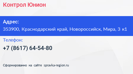 Контрол Юнион по адресу 353900, Краснодарский край, Новороссийск, Мира, 3 к1 в дальнейшем Организация, размещена в следующих категориях: