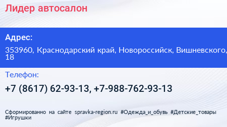Лидер, автосалон по адресу 353960, Краснодарский край, Новороссийск, Вишневского, 18 в дальнейшем Организация, размещена в следующих категориях: