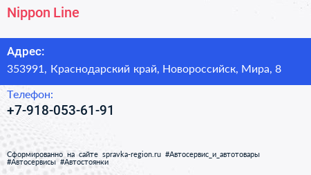 Nippon Line по адресу 353991, Краснодарский край, Новороссийск, Мира, 8 в дальнейшем Организация, размещена в следующих категориях:
