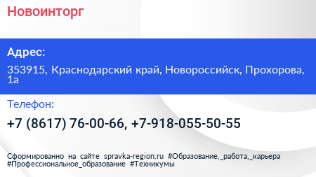 Новоинторг по адресу 353915, Краснодарский край, Новороссийск, Прохорова, 1а в дальнейшем Организация, размещена в следующих категориях: