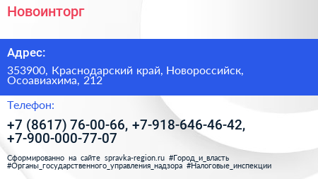 Новоинторг по адресу 353900, Краснодарский край, Новороссийск, Осоавиахима, 212 в дальнейшем Организация, размещена в следующих категориях: