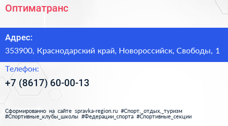 Оптиматранс по адресу 353900, Краснодарский край, Новороссийск, Свободы, 1 в дальнейшем Организация, размещена в следующих категориях: