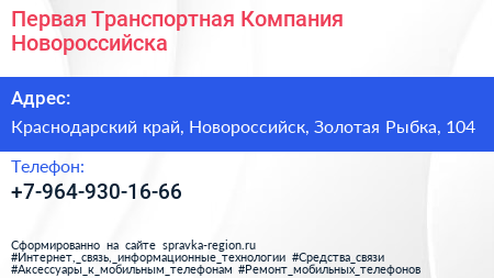 Первая Транспортная Компания Новороссийска по адресу Краснодарский край, Новороссийск, Золотая Рыбка, 104 в дальнейшем Организация, размещена в следующих категориях: