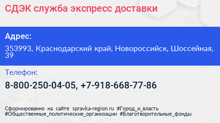 СДЭК, служба экспресс-доставки по адресу 353993, Краснодарский край, Новороссийск, Шоссейная, 39 в дальнейшем Организация, размещена в следующих категориях:
