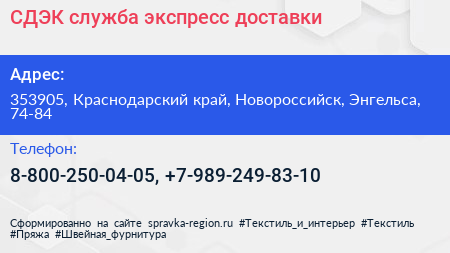 СДЭК, служба экспресс-доставки по адресу 353905, Краснодарский край, Новороссийск, Энгельса, 74-84 в дальнейшем Организация, размещена в следующих категориях: