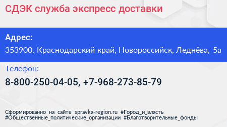 СДЭК, служба экспресс-доставки по адресу 353900, Краснодарский край, Новороссийск, Леднёва, 5а в дальнейшем Организация, размещена в следующих категориях:
