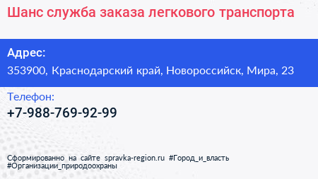 Шанс, служба заказа легкового транспорта по адресу 353900, Краснодарский край, Новороссийск, Мира, 23 в дальнейшем Организация, размещена в следующих категориях:
