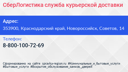 СберЛогистика, служба курьерской доставки по адресу 353900, Краснодарский край, Новороссийск, Советов, 14 в дальнейшем Организация, размещена в следующих категориях:
