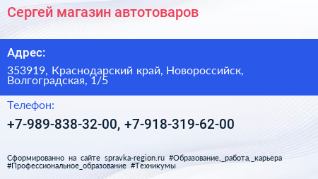 Сергей, магазин автотоваров по адресу 353919, Краснодарский край, Новороссийск, Волгоградская, 1/5 в дальнейшем Организация, размещена в следующих категориях: