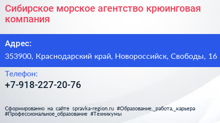 Сибирское морское агентство, крюинговая компания по адресу 353900, Краснодарский край, Новороссийск, Свободы, 16 в дальнейшем Организация, размещена в следующих категориях: