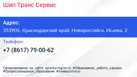 Шип Транс Сервис по адресу 353905, Краснодарский край, Новороссийск, Исаева, 2 в дальнейшем Организация, размещена в следующих категориях: