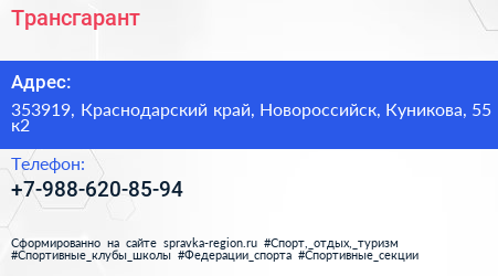 Трансгарант по адресу 353919, Краснодарский край, Новороссийск, Куникова, 55 к2 в дальнейшем Организация, размещена в следующих категориях: