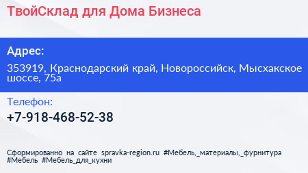 ТвойСклад для Дома & Бизнеса по адресу 353919, Краснодарский край, Новороссийск, Мысхакское шоссе, 75а в дальнейшем Организация, размещена в следующих категориях: