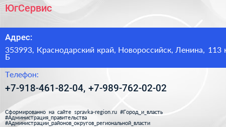 ЮгСервис по адресу 353993, Краснодарский край, Новороссийск, Ленина, 113 к Б в дальнейшем Организация, размещена в следующих категориях: