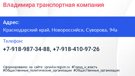 Владимира, транспортная компания по адресу Краснодарский край, Новороссийск, Суворова, 94а в дальнейшем Организация, размещена в следующих категориях: