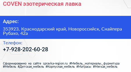 COVEN, эзотерическая лавка по адресу 353923, Краснодарский край, Новороссийск, Снайпера Рубахо, 42а в дальнейшем Организация, размещена в следующих категориях: