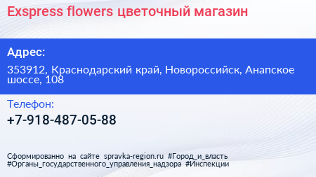 Exspress flowers, цветочный магазин по адресу 353912, Краснодарский край, Новороссийск, Анапское шоссе, 108 в дальнейшем Организация, размещена в следующих категориях: