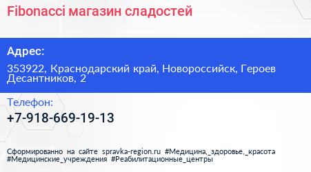 Fibonacci, магазин сладостей по адресу 353922, Краснодарский край, Новороссийск, Героев Десантников, 2 в дальнейшем Организация, размещена в следующих категориях: