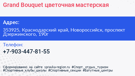 Grand Bouquet, цветочная мастерская по адресу 353925, Краснодарский край, Новороссийск, проспект Дзержинского, 190г в дальнейшем Организация, размещена в следующих категориях: